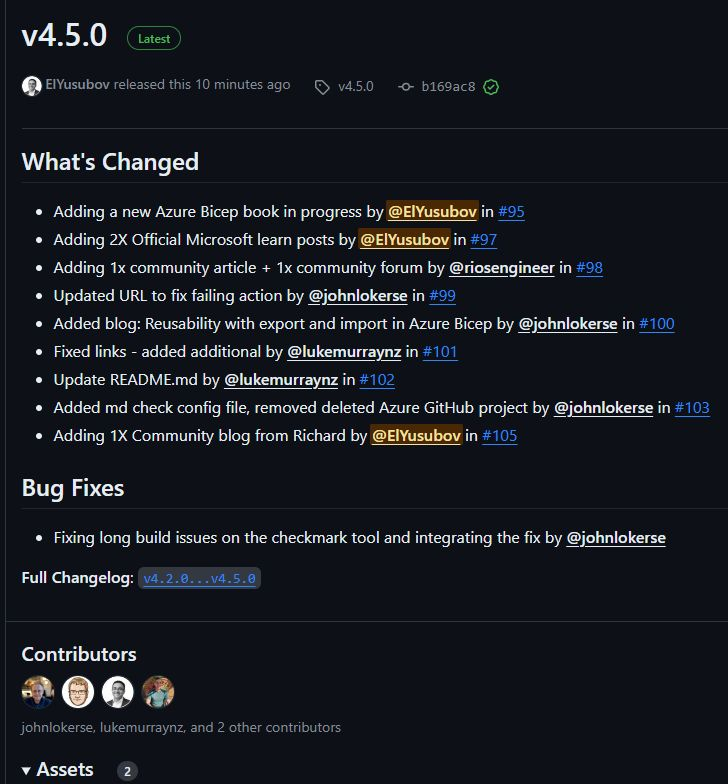 I also teamed up with John Lokerse to troubleshoot and fix the link checkmark build in this release. In addition, our core member and Microsoft MVP, Luke Murray, has updated several links on his Bicep blog posts, as his URLs have been changed.