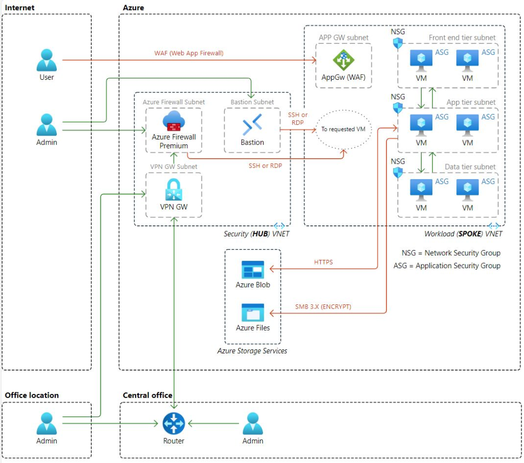 There is a good reference to architectural diagram on Microsoft Learn documentation. You could use the Use the following diagram as a starting point to secure access to the VNet and applications in your Azure environment.