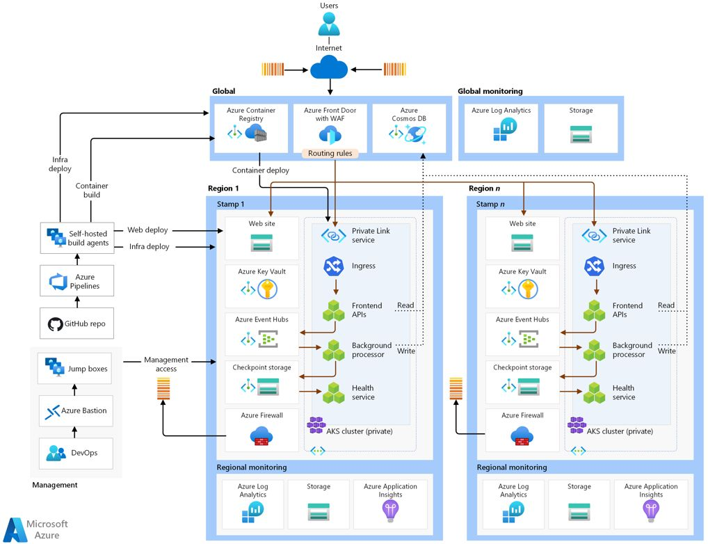 Following is a reference architecture from Microsoft learn documentation that aims to address the Mission-critical baseline architecture on Azure – and is focused on maximizing reliability and operational effectiveness.